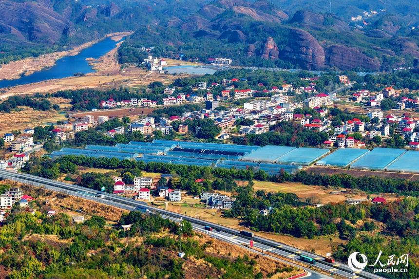 赣州市兴国县江背镇华坪村,公路蜿蜒穿梭于山峦间,与河流、田野、村舍、葱郁远山相映成画。人民网记者 朱海鹏摄