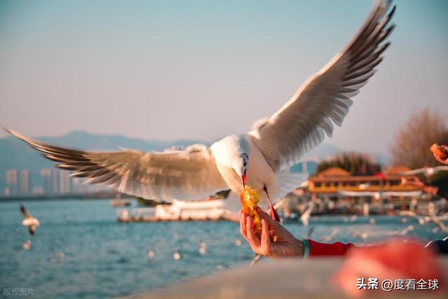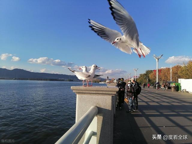 海埂的烟火气,在冬春时节达到顶峰。每年十一月至次年三月,西伯利亚的红嘴鸥跨越万里,如期飞抵滇池,海埂公园便成为观赏与互动的最佳地点。这些白色的精灵在湖面盘旋、嬉戏,时而俯冲至岸边,啄食游客手中的鸥粮,时而掠过水面,激起阵阵涟漪。清晨的海埂,常有摄影爱好者早早守候,捕捉红嘴鸥展翅的瞬间;午后的草坪上,家长带着孩子投喂海鸥,孩子们的笑声与海鸥的鸣叫声交织在一起,温暖了整个冬日。