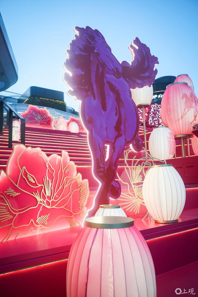 同期,天马艺术装置落户中央公园东大草坪,新春游园会于东大台阶及喷泉广场开启,以沉浸式光影体验丰富市民节日文化生活。