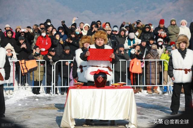 活动开场的祭湖醒网仪式,是整个冬捕流程中最具文化厚重感的环节。鱼把头身着传统服饰,手持酒坛与五谷,以苍劲嗓音诵念百年《祭湖辞》,字句间满是对天地的敬畏、对湖泽的感恩。行九扣大礼,抛撒五谷寓意丰饶,洒下白酒敬谢自然,这套完整的古朴仪式,并非刻意复刻的表演,而是渔猎文化中“天人合一”理念的生动诠释。在生产力低下的古代,东北先民依赖冰雪馈赠生存,祭湖仪式既是对自然的敬畏,也是对丰收的祈愿,这种文化基因穿越千年,在秀湖冰面上得以完整保留。