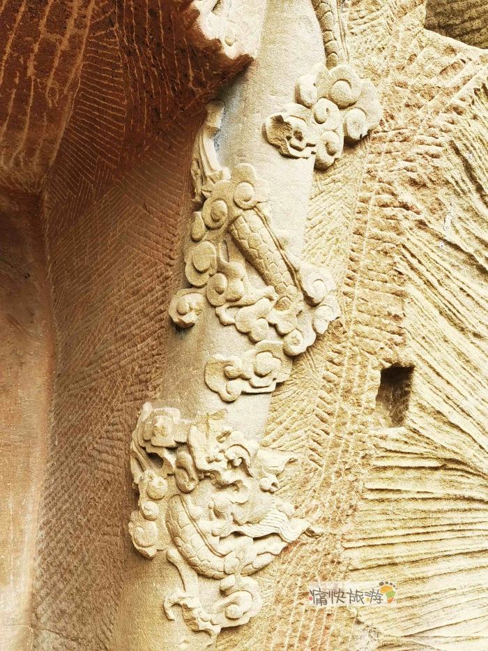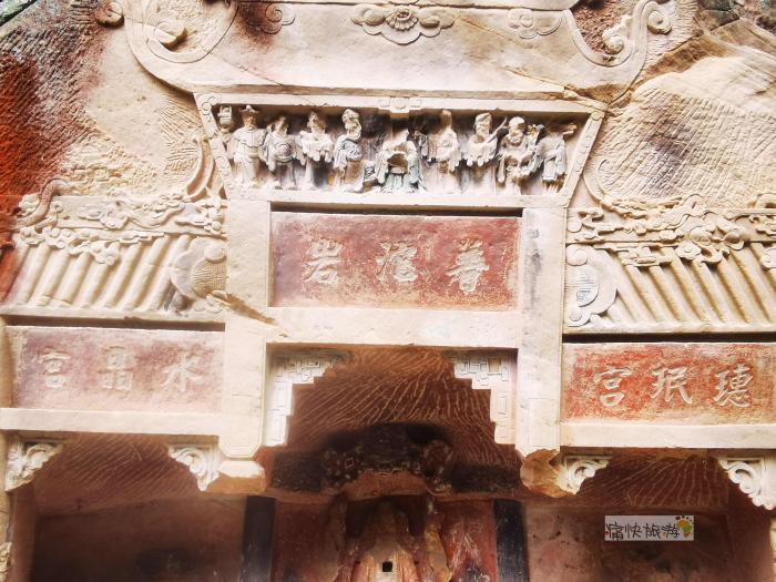 普沱岩摩崖造像规模虽然不大,工匠运用阳刻、阴刻等多种雕刻手法在岩石上立体展示出重檐歇山顶的殿宇,四柱三间上方分别对应着“水晶宫、普沱岩、璤珉宫”,尚存部分彩绘痕迹。