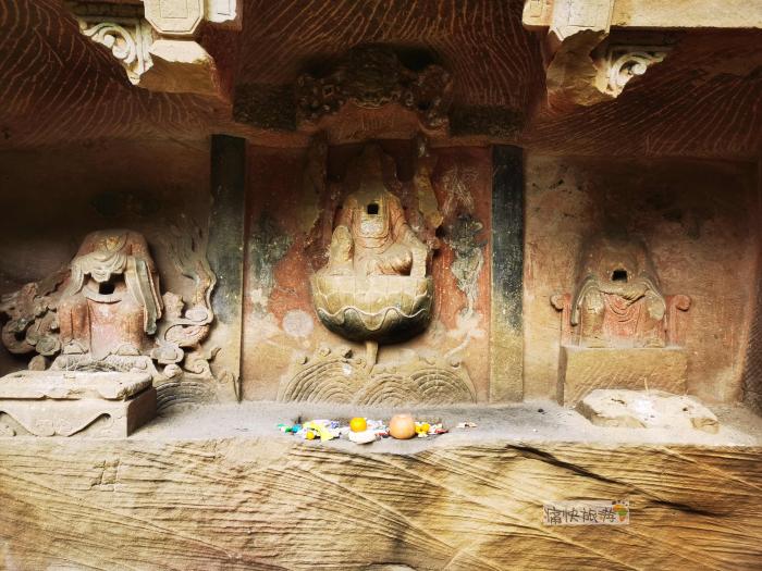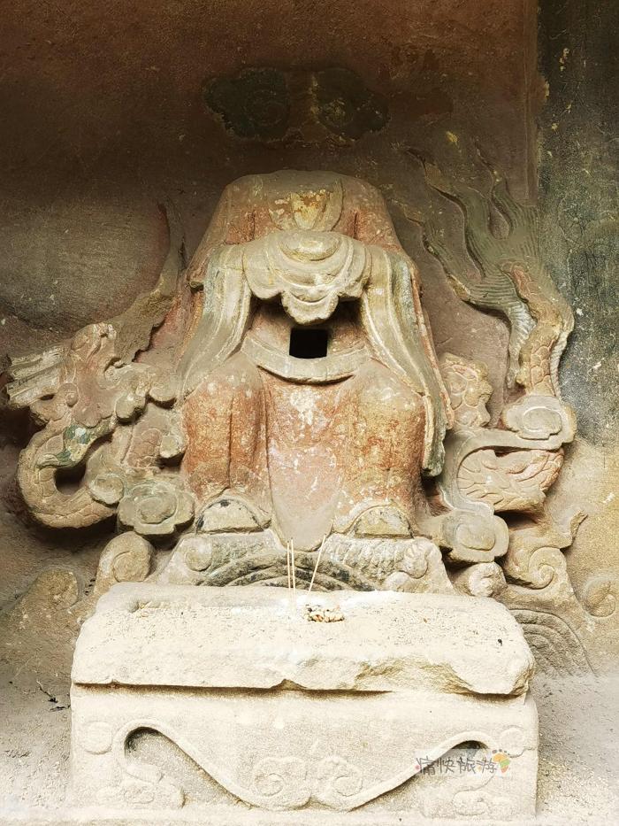 明间的观音造像除头部毁损外,基本较为完整。底部的波涛支撑其莲花座,观音整体雕刻简洁,胸口的方孔不知是不是后来开凿的,两侧依稀可见善财童子和龙女的彩绘图案。