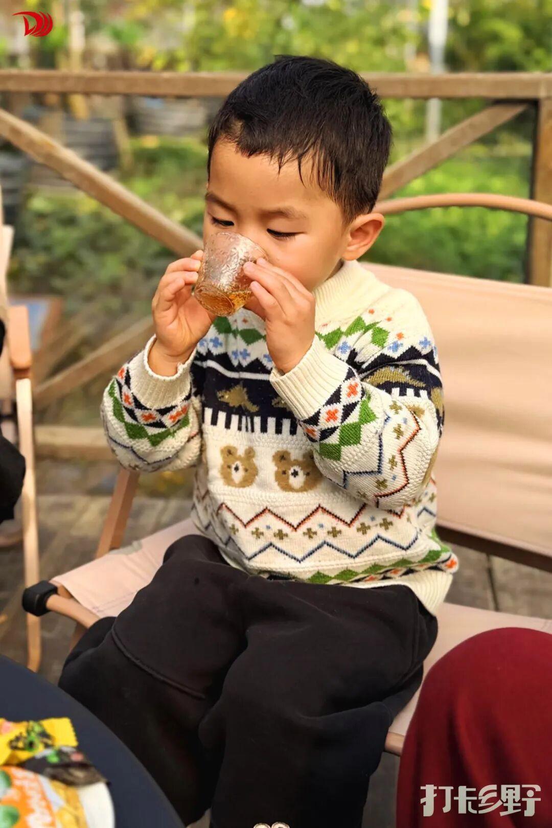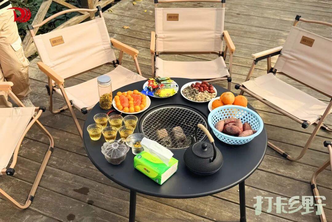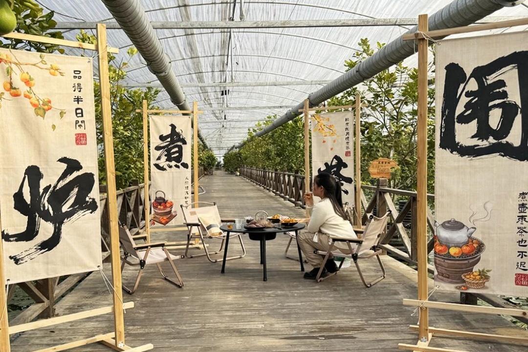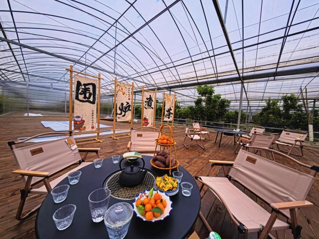 玩累了,就钻进温室一角的茶歇区。套餐已经备好在矮木桌上:小炭炉、陶壶、一篮农场自采的茶点——金桔还带着枝叶,柚子剥成月牙状,“红美人”柑橘果肉饱满;旁边是烤得微微焦香的红薯、一小碟瓜子、几颗红枣,还有独立包装的饼干与糕点。