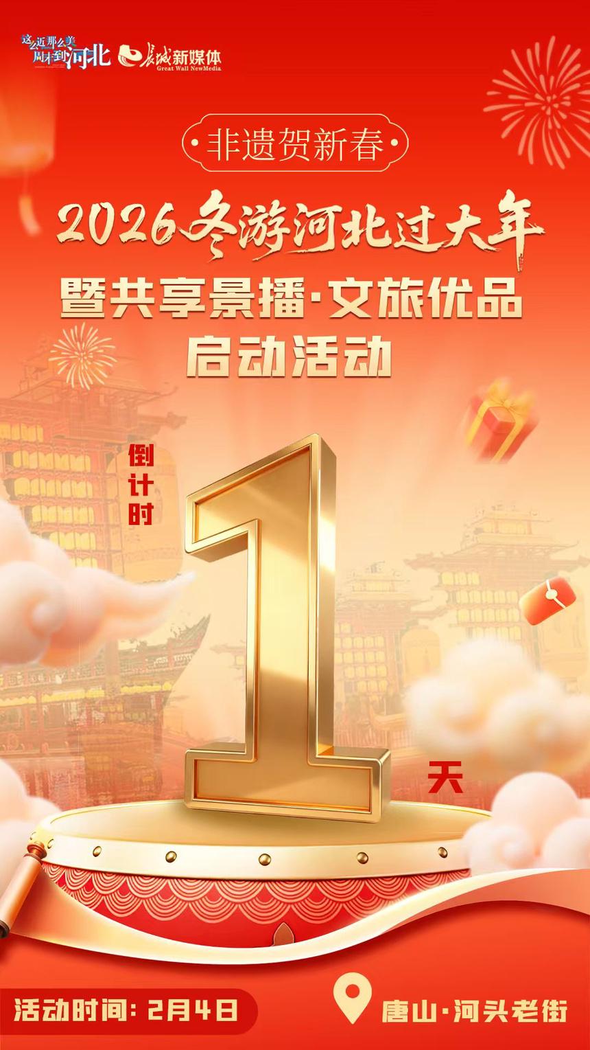 “非遗贺新春”2026冬游河北过大年暨共享景播·文旅优品启动活动将于2月4日在河北省唐山市河头老街启动。本次活动由河北省文化和旅游厅、唐山市人民政府主办,河北省群众艺术馆(河北省非物质文化遗产保护中心)、唐山市文化广电和旅游局、唐山市丰南区人民政府承办。敬请期待!