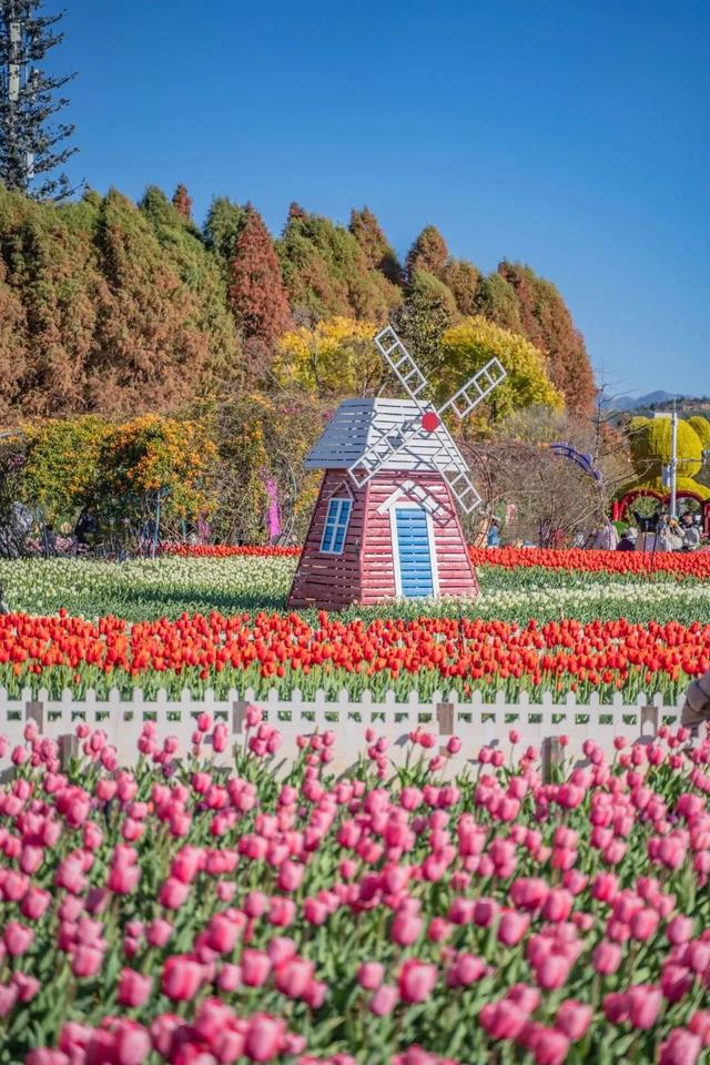 漫步花海间,郁金香亭亭玉立、竞相争艳,微风拂过,花香裹挟着滇池的湿润气息扑面而来,沁人心脾。