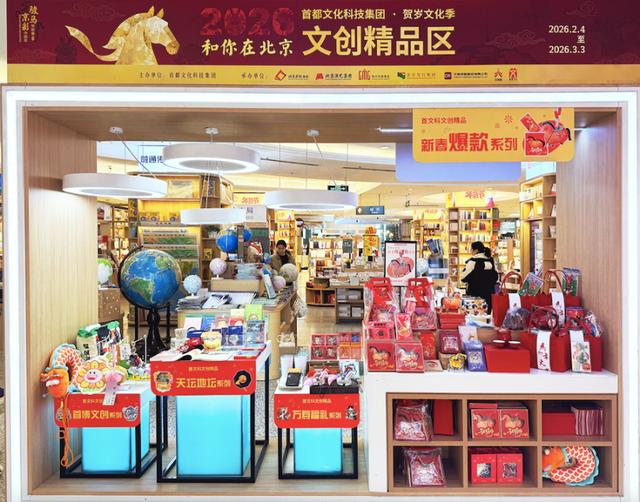 首文科文创专柜集中展售该集团自主研发及与首都博物馆(含老舍纪念馆)、孔庙和国子监博物馆、北京艺术博物馆、天坛公园、地坛公园等联合推出的200余款精品文创,以及“马上有喜柿”和“马上有福气”等新春文化礼包。其中“马年有喜‘柿’”礼包内含主题香囊挂件、杯垫等,融合老舍先生丹柿小院的文化底蕴与马年生肖的巧思创意,憨态可掬、寓意吉祥;“马上有福气”礼包内含小马毛绒盲盒、年年有“鱼”随手擦等,兼具实用趣味与美好祝愿。