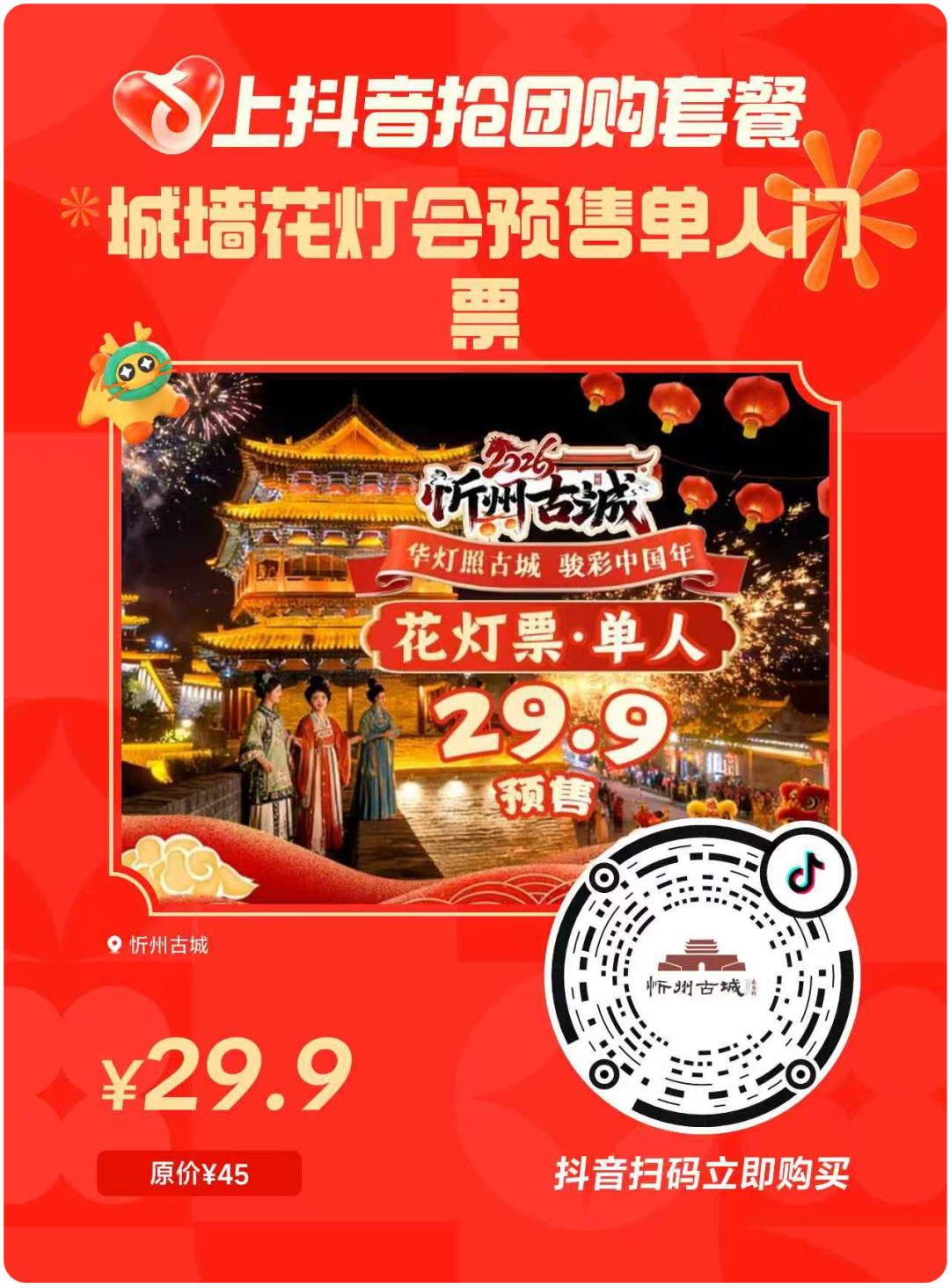 2026忻州古城城墙灯展预售通道已经开启!原价45元的灯展门票,预售价仅需29.9元!
