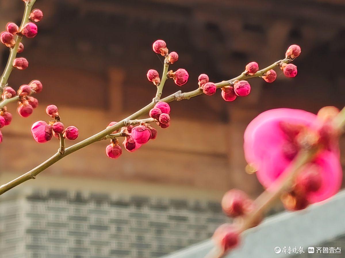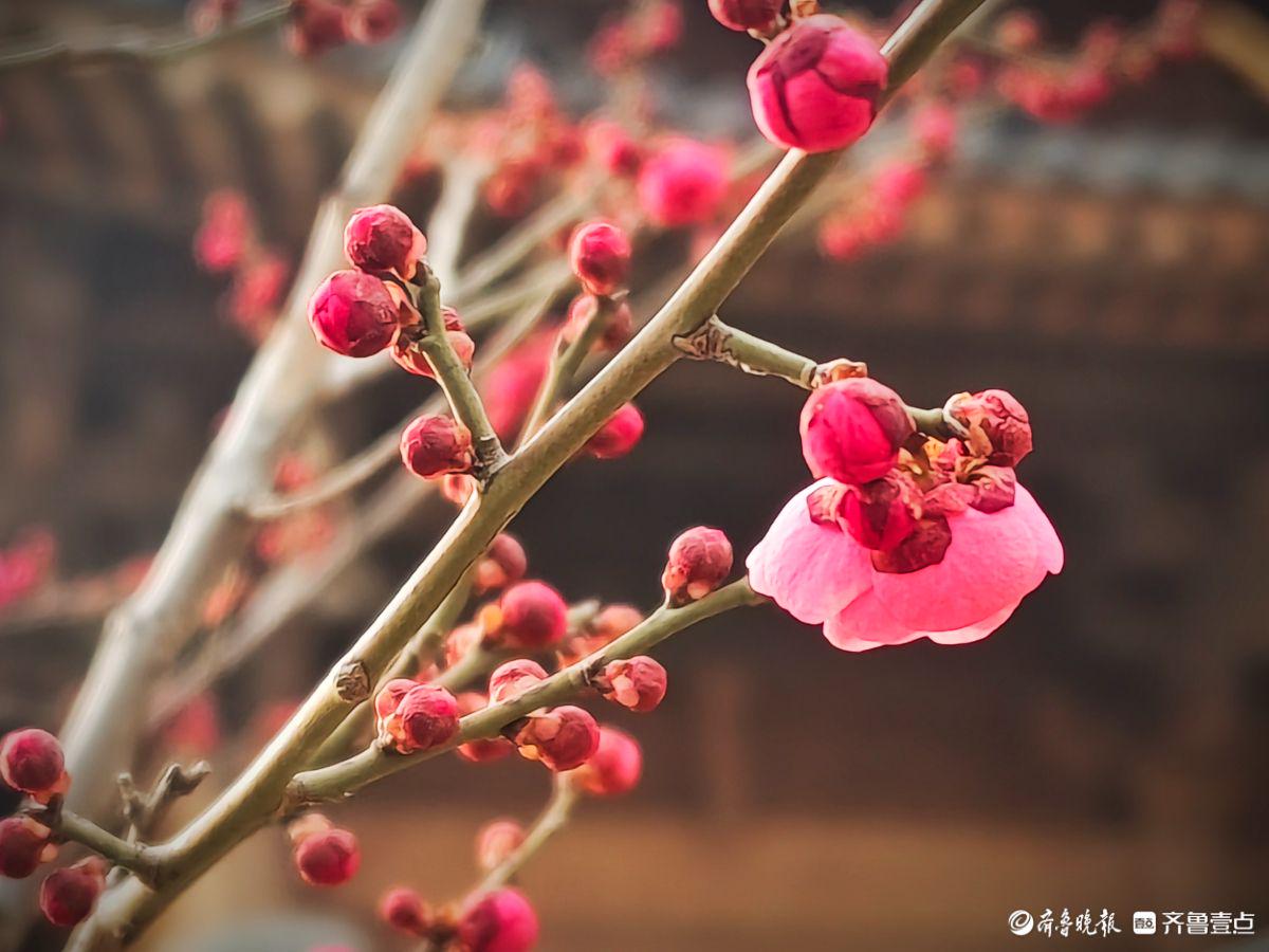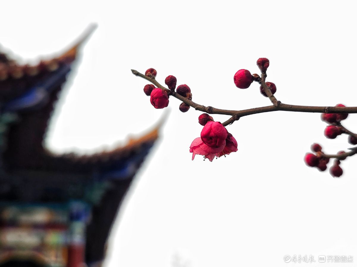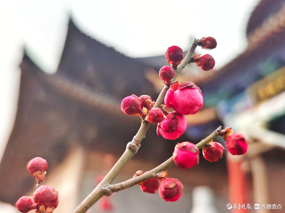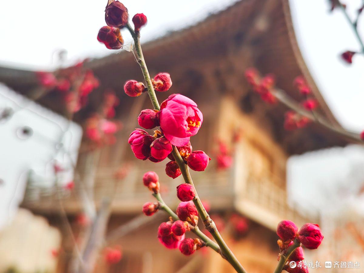 2月4日,立春季节来临,临沂沂河新区皇山盛境红梅喜迎春。看呐,密密麻麻的花骨朵在枝头竞相绽放,就像给公园换上了喜庆的红装。漫步在公园里,红梅的艳丽与周围仿古建筑的景色相互映衬,让整个皇山盛境充满了生机。 高军 摄