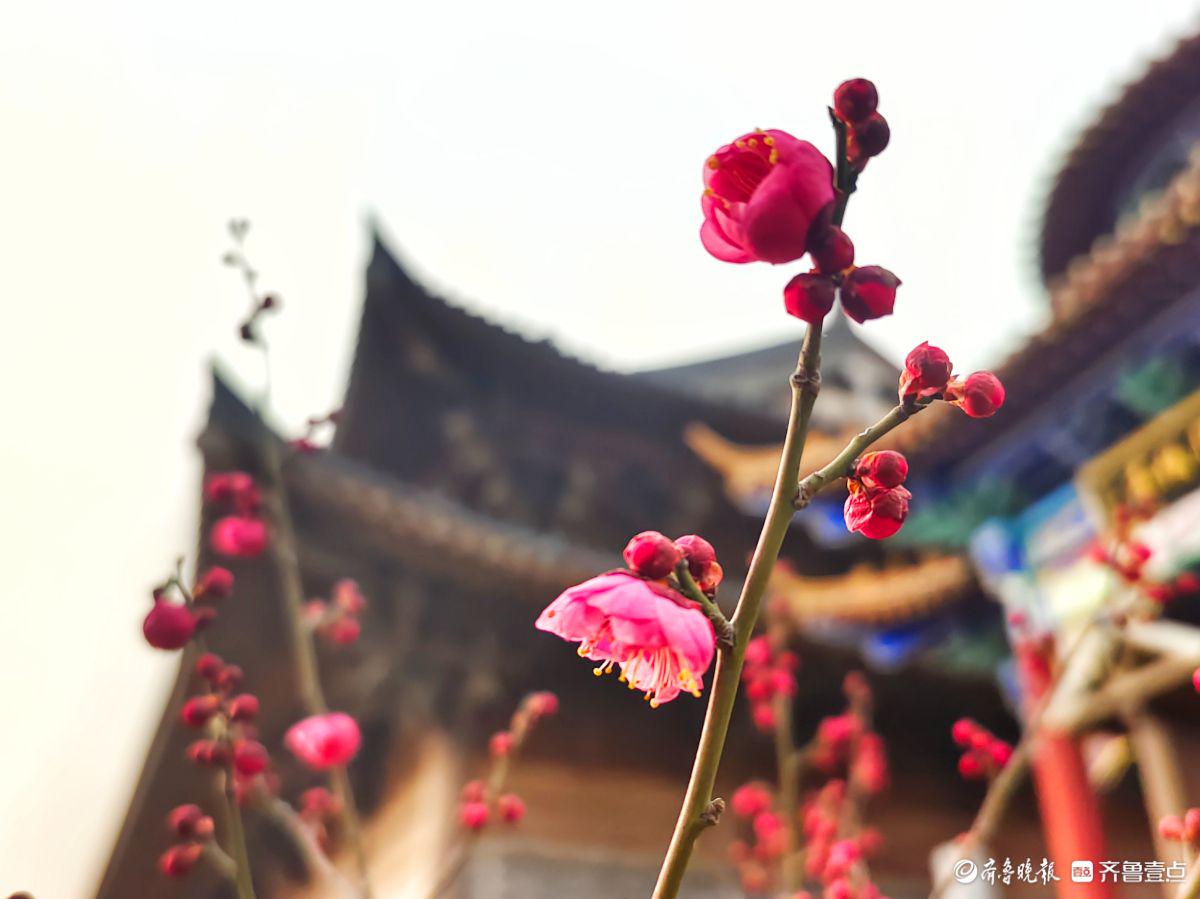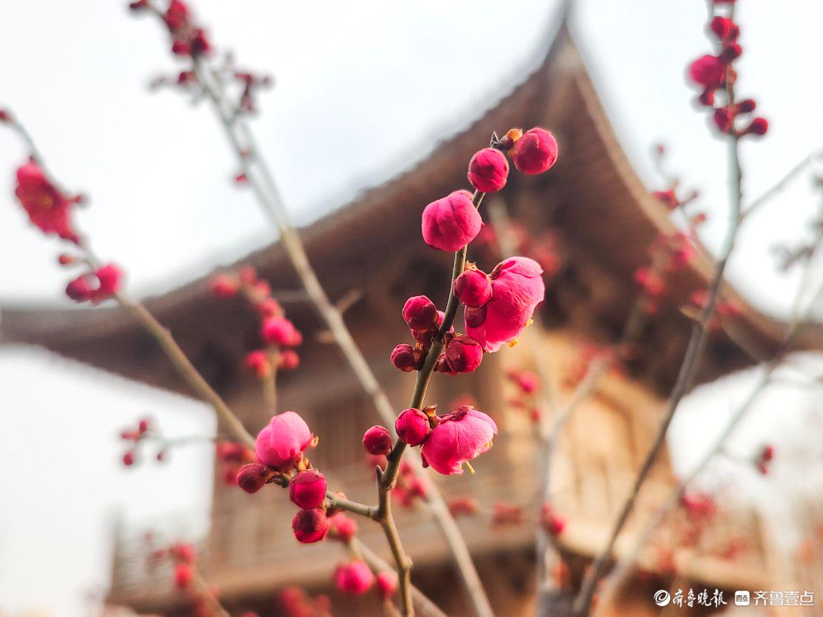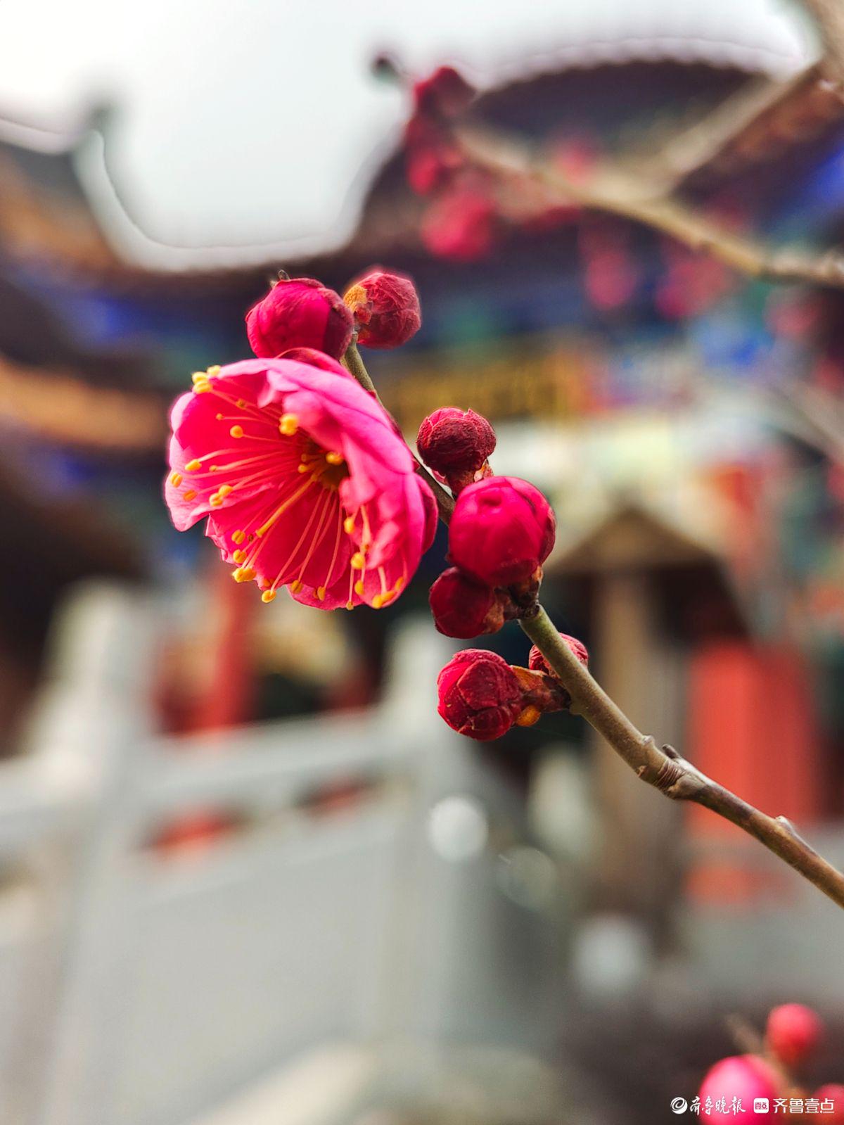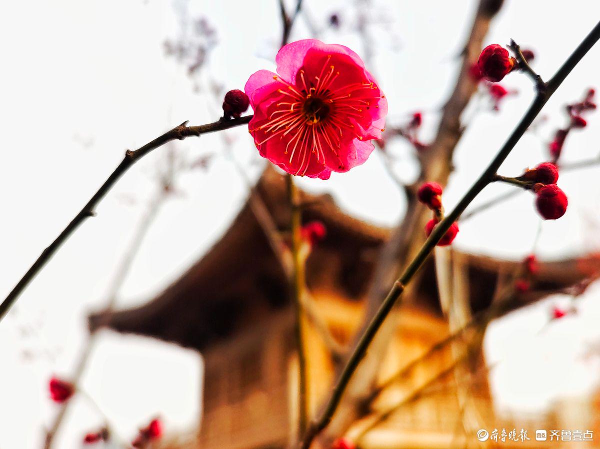 2月4日,立春季节来临,临沂沂河新区皇山盛境红梅喜迎春。看呐,密密麻麻的花骨朵在枝头竞相绽放,就像给公园换上了喜庆的红装。漫步在公园里,红梅的艳丽与周围仿古建筑的景色相互映衬,让整个皇山盛境充满了生机。 高军 摄