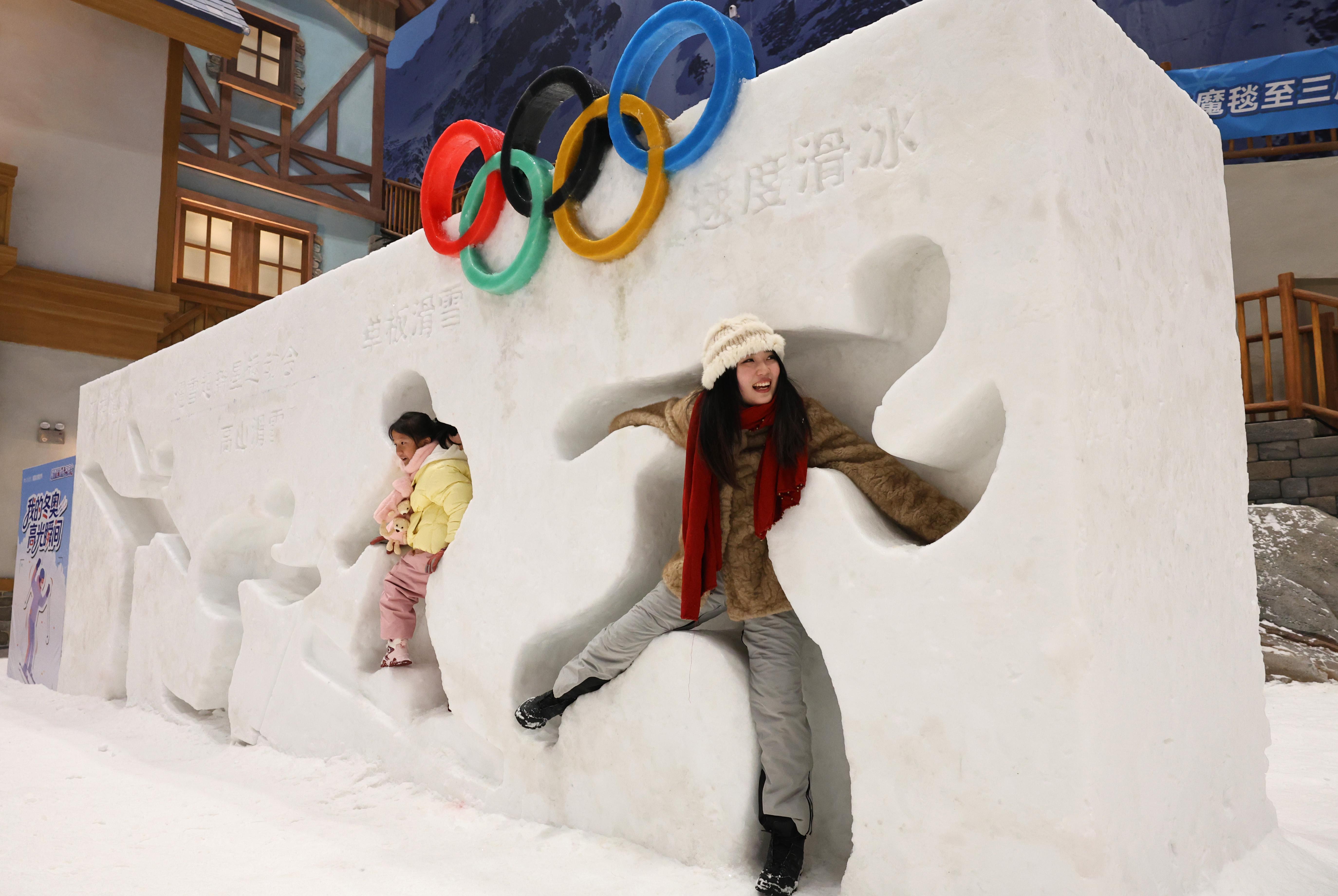 2月3日,游客们在上海耀雪冰雪世界体验“冬奥雪雕打卡墙”。新华社记者 方喆 摄