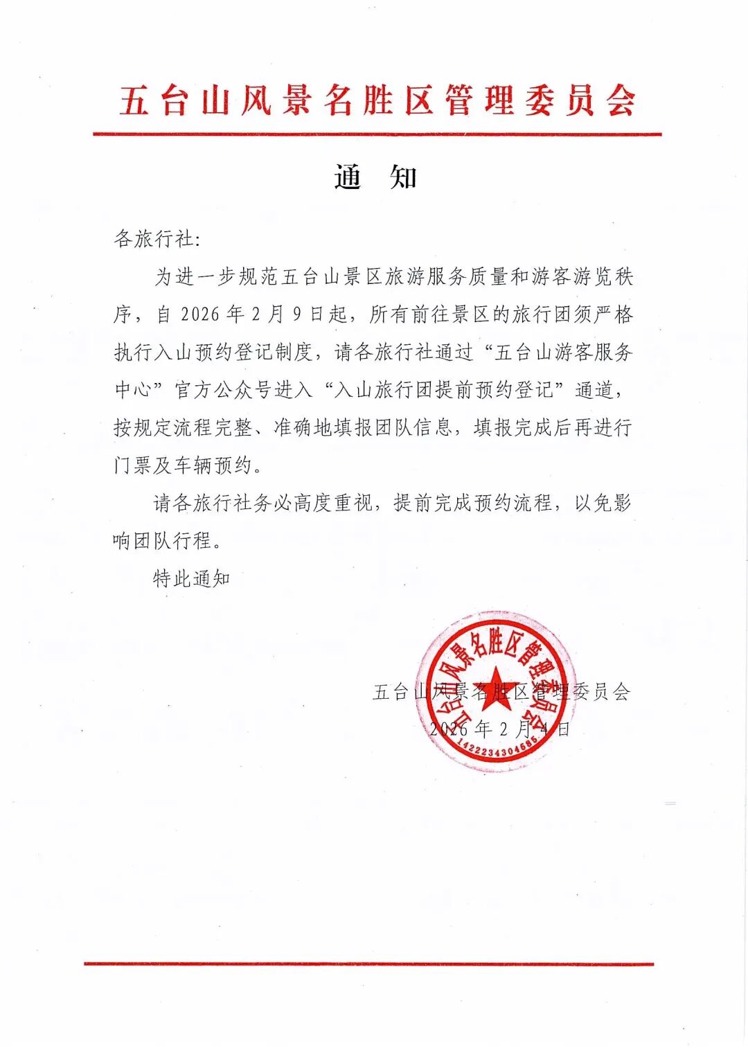 为进一步规范五台山景区旅游服务质量和游客游览秩序,自2026年2月9日起,所有前往景区的旅行团须严格执行入山预约登记制度,请各旅行社通过“五台山游客服务中心”官方公众号进入“入山旅行团提前预约登记”通道,按规定流程完整、准确地填报团队信息,填报完成后再进行门票及车辆预约。
