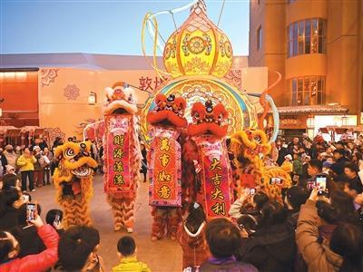 游客在甘肃省敦煌夜市观看舞狮表演。