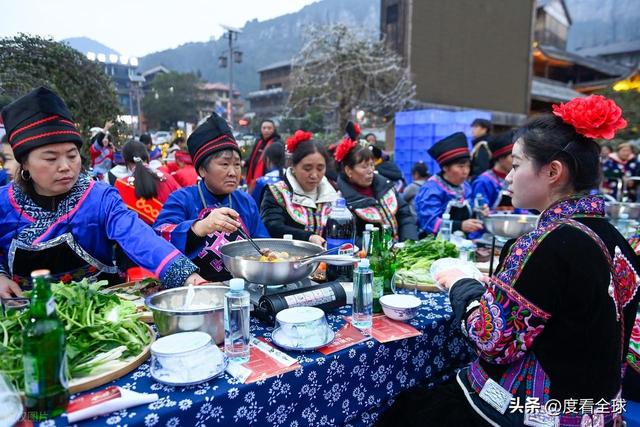 酒过三巡,菜过五味,民俗展演在长桌宴旁悄然拉开帷幕,将现场的气氛推向一个又一个高潮。苗王巡城气势恢宏,身着苗王服饰的老者端坐其间,随从们手持兵器,步伐整齐,神情庄重,仿佛穿越千年,再现了古代苗王巡街的盛景,每一步都踏在文化的脉络上,每一个姿态都彰显着民族的气节。百人开宴仪式庄严而隆重,居民与游客一同起身,双手合十,许下对新春的美好愿望,祈求来年风调雨顺、五谷丰登、阖家幸福,简单的仪式里,藏着人们对生活的热爱与期许。