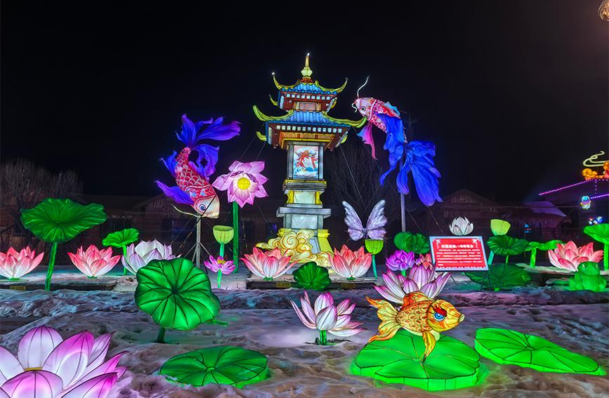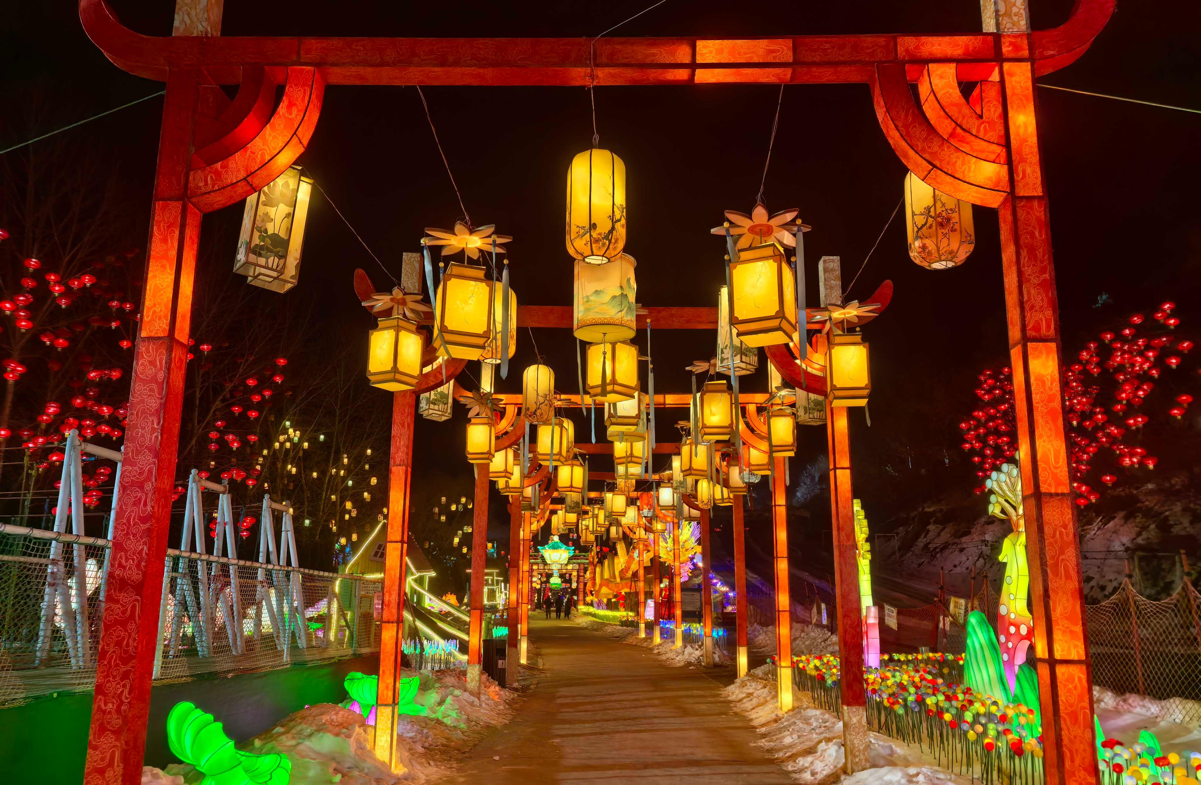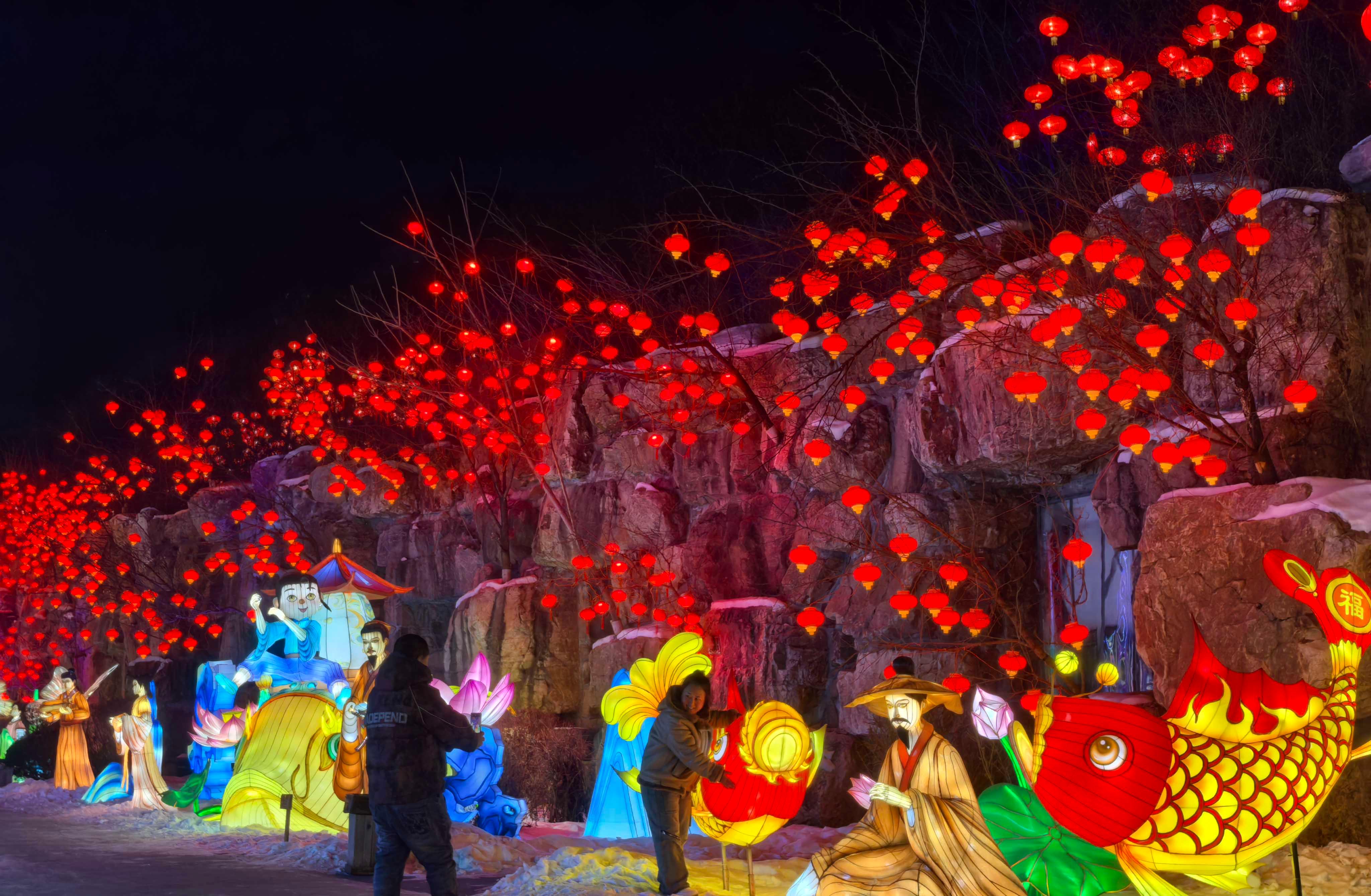 此次灯会由千山老院子景区匠心打造,特邀四川自贡非遗彩灯匠人,以精湛技艺点亮古院。灯会精心规划瑞兽闹春、鱼跃福运、鸟语花香、蝶舞鹿跃、十里灯街、上元灯市六大主题区。最具亮点的是,灯会将传统灯彩的精巧工艺与现代光影科技巧妙融合,光影流转间,带给游客穿越千年的沉浸式体验。352组花灯以明代《上元灯彩图》为创意核心,沿庭院脉络徐徐铺展,生动再现“流光溢彩升平夜,火树银花不夜天”的唯美意境,成为鞍山冬日里最耀眼的文旅新名片。(人民网记者 王斯文文并摄)