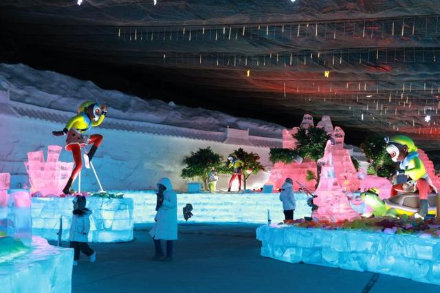 龙庆峡毗邻石京龙滑雪场。夜幕降临,龙庆峡冰灯艺术节正在迎接八方来客。光影流转间,崖壁与冰雕相映成趣,沉寂的峡谷被万千灯火点亮,变成奇幻秘境。本届冰灯艺术节以国产动画经典《大闹天宫》IP为灵感打造奇幻冰境,“灵猴现世”展区中石猴神态鲜活;“龙宫借宝”展区里虾兵蟹将惟妙惟肖;“灵霄宝殿”层叠有致、晶莹剔透,尽显天宫威严……