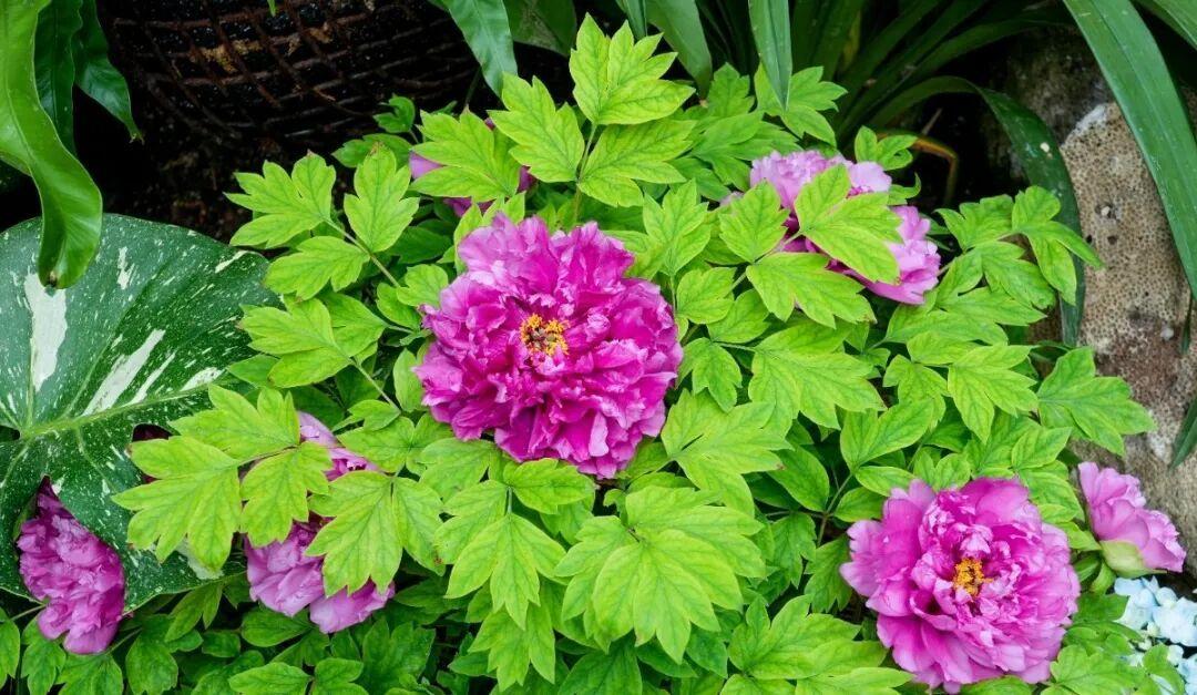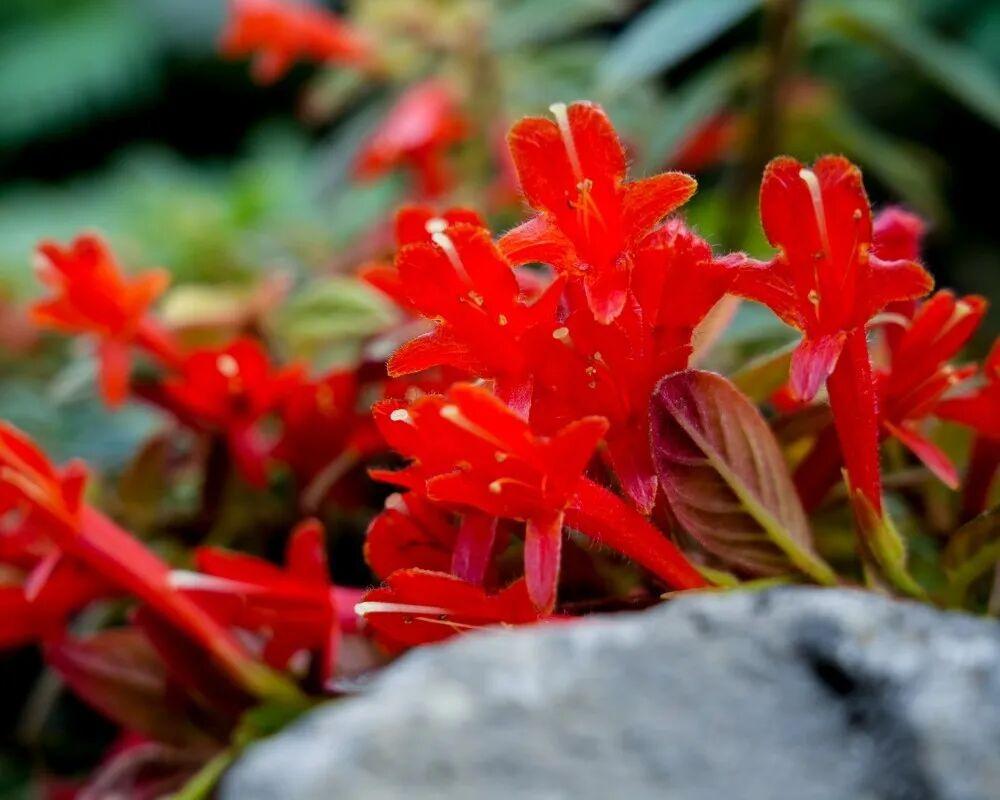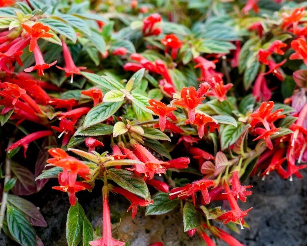 山地植物馆入口区域陈列有兼具红花、红叶的苦苣苔与秋海棠,并搭配彩色马蹄莲等应景植物进行联合造景。