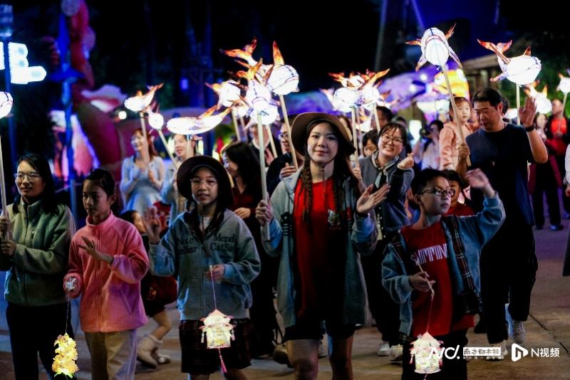 互动体验方面,园区邀请全园游客共同参与鱼灯制作,游客可携带自制花灯加入巡游队伍,在动手实践中感受节庆的欢乐与传统文化的魅力。来自广州的游客李女士带着孩子参与了鱼灯制作,她笑着说道:“既能让孩子动手体验传统手工艺,又能参与巡游感受年味,还能近距离看到鲲鹏空飘,这样的新春体验特别有意义,也让孩子感受到了中国传统文化的美好。”