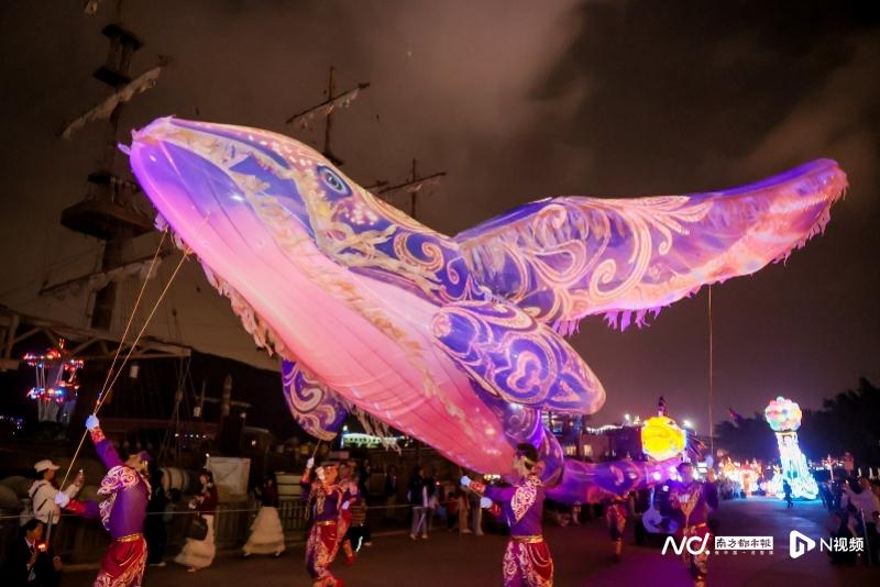 园区内人头攒动,巨型“鲲鹏”昂首振翅划破夜空……2月7日,横琴长隆最大的空飘装置——巨型鲲鹏空飘惊艳亮相、震撼升空,其身姿舒展、流光溢彩,羽翼间流转的荧光与园区海洋景观交相辉映,与市民游客共同组成的百人鲲鹏鱼灯巡游方阵遥相呼应。一静一动间,成为当日最具辨识度的视觉亮点,引得现场游客纷纷驻足拍照留念。