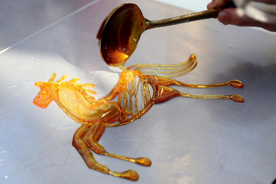 非遗北派糖画第四代传承人刘治廷制作“春风得意马蹄疾”。