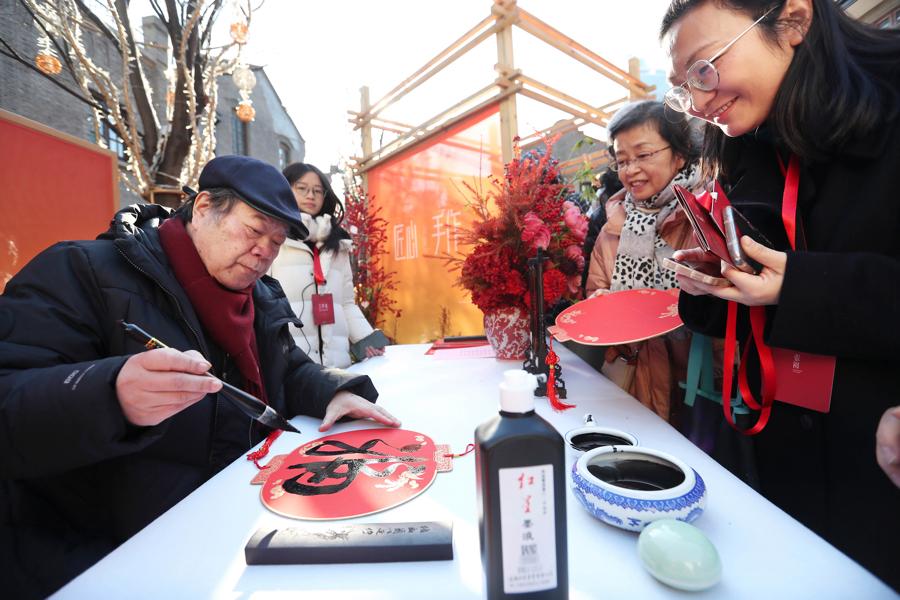 中国龙狮九段、国家级非遗传承人陆大杰领衔龙狮献瑞巡游茂名北路;上海民族乐团非遗丝竹管弦勾勒出一幅生动的海派音画。在12号楼广场前,书法家丁申阳率队、非遗撕纸传承人华兴富、版画艺术家金雯等来到现场,传统技艺在指尖重生,重现张园历史上“游园观艺”的雅趣盛景。