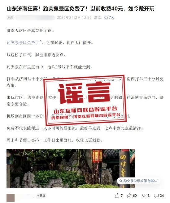 济南互联网联合辟谣平台提醒广大市民和游客,春节假期临近,出行游玩需求增多,景区相关票务政策、开放时间等重要信息,请通过官方正规渠道获取,自觉做到不造谣、不信谣、不传谣,共同维护清朗网络空间。