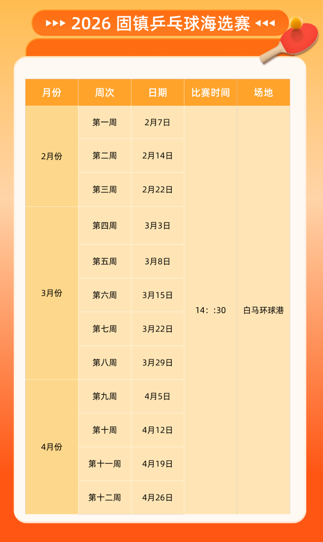 活动地点:白马环球港一楼大厅(或三楼繁星乒乓球俱乐部)