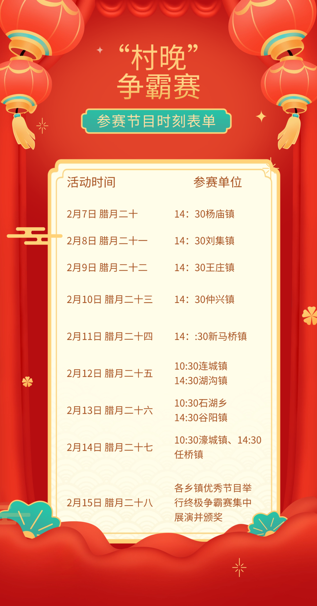 “集”结年味,“晚”聚人心。让年货大集的“烟火气”与乡村文艺的“泥土香”交织共鸣。采用“单日竞赛制”,各代表队分9天登场,每日展演+评比,当日决出优胜节目,2月15日举行决赛并颁奖。