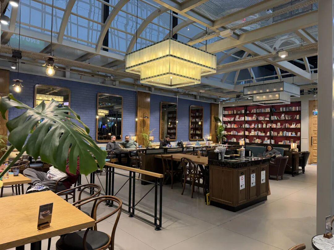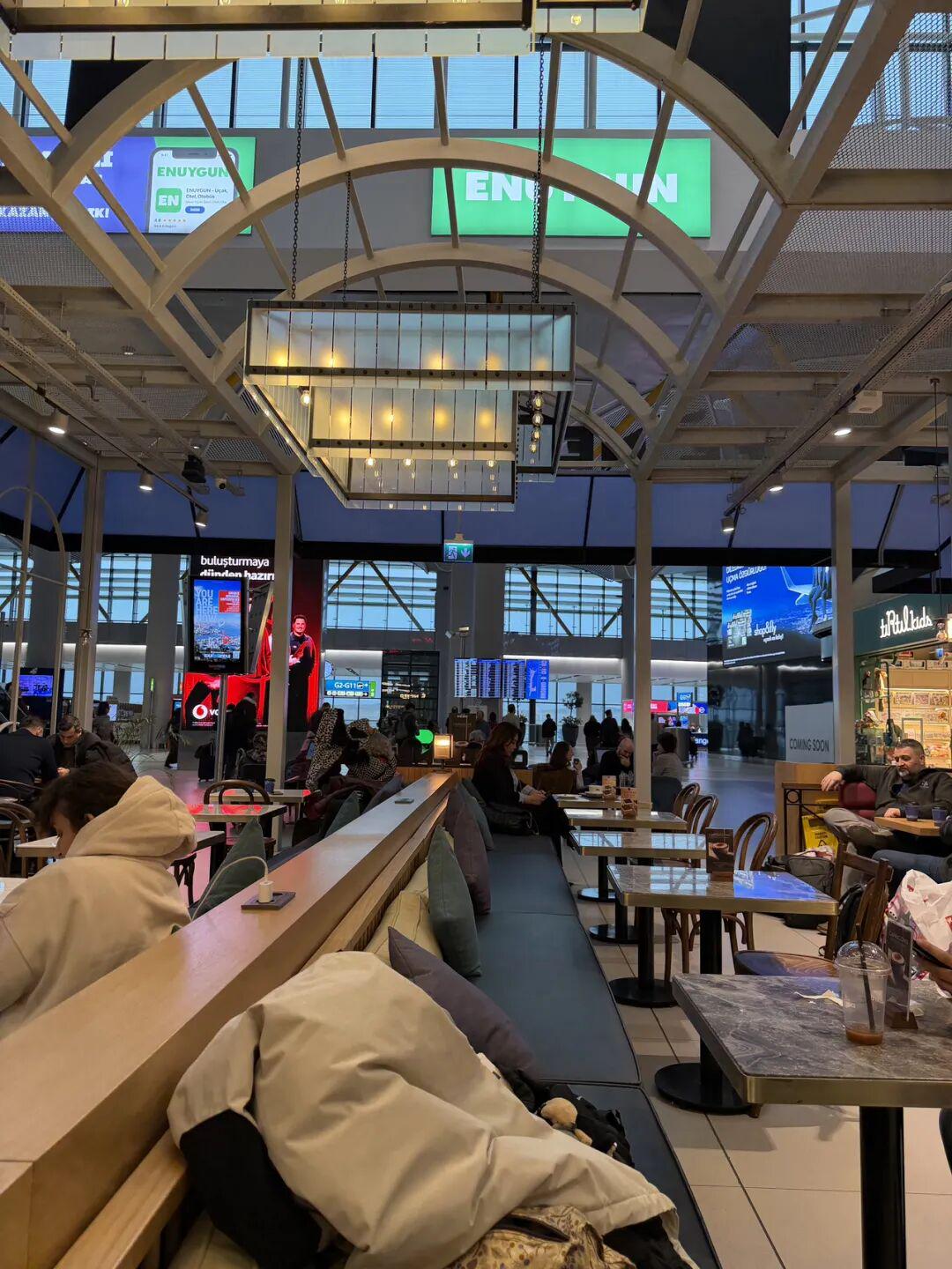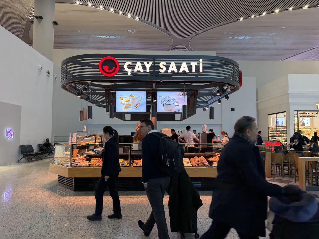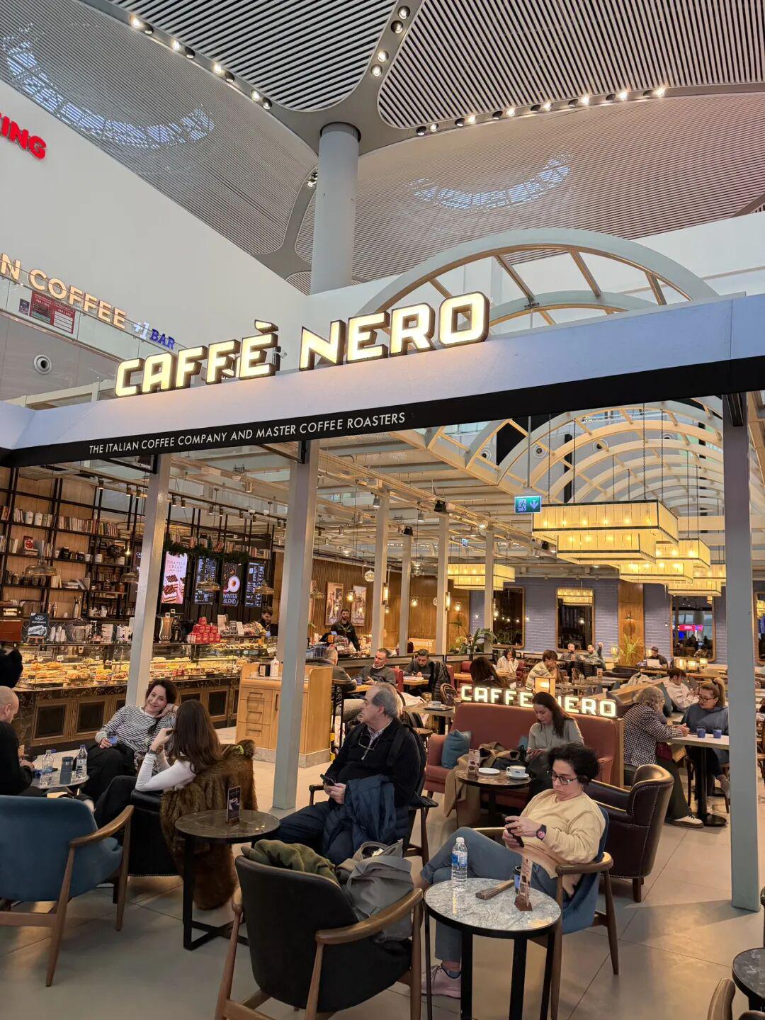 照片:伊斯坦布尔国际机场非常的宽敞明亮、舒适大气,咖啡厅也很具有艺术气息,候机的游客可以在这里做短暂的休息,咖啡有点贵,换成人民币大概50元。