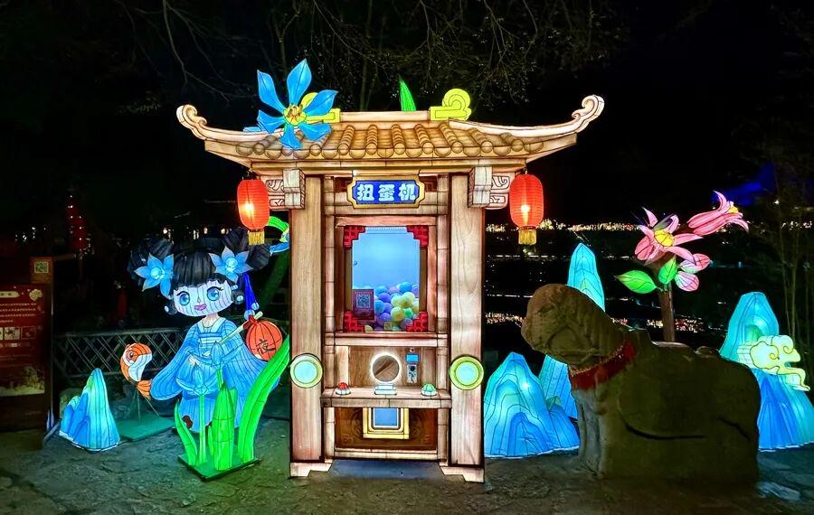亭台间,自贡彩灯流光溢彩;厅堂内,非遗展览令人流连;园林里,民俗市集等你来逛;还有首座“古风扭蛋机”矗立水边,既能出片又能试试新年手气……