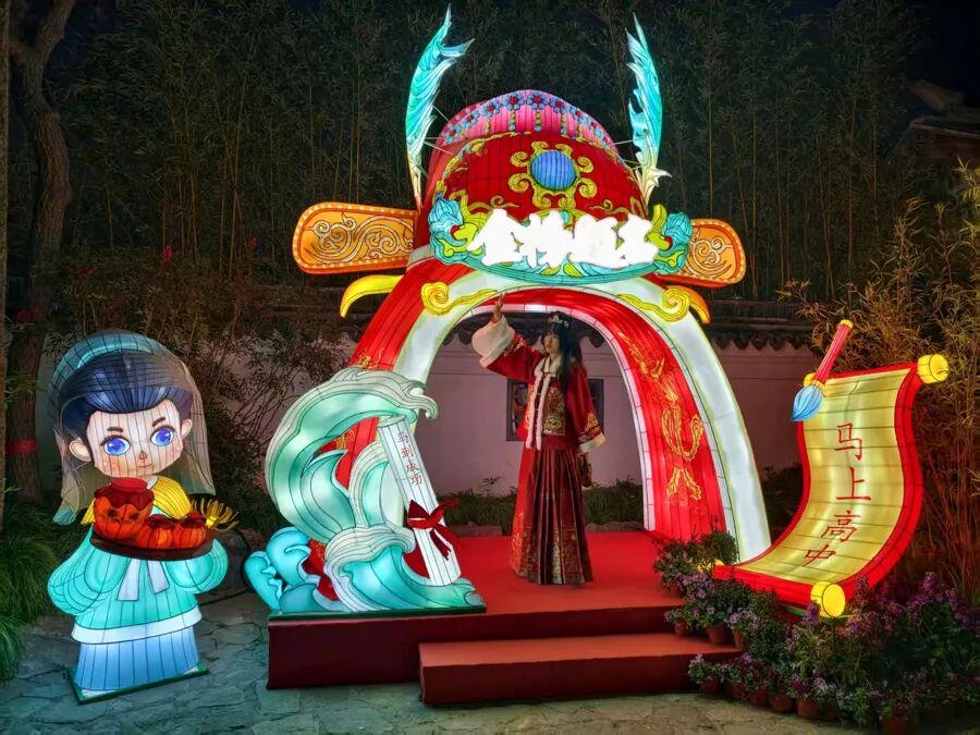 走进古猗园,采用四川自贡非遗灯彩技艺制作的灯组将园内装扮一新。南大门入口处,古典仕女雅逸的身姿与“状元骑马”喜庆场景相映成趣,搭配花卉、圆月等元素,一入园便将新春氛围“拉满”。照壁区域,四方体宫灯的四面以“春夏秋冬”呼应“人生四时”。