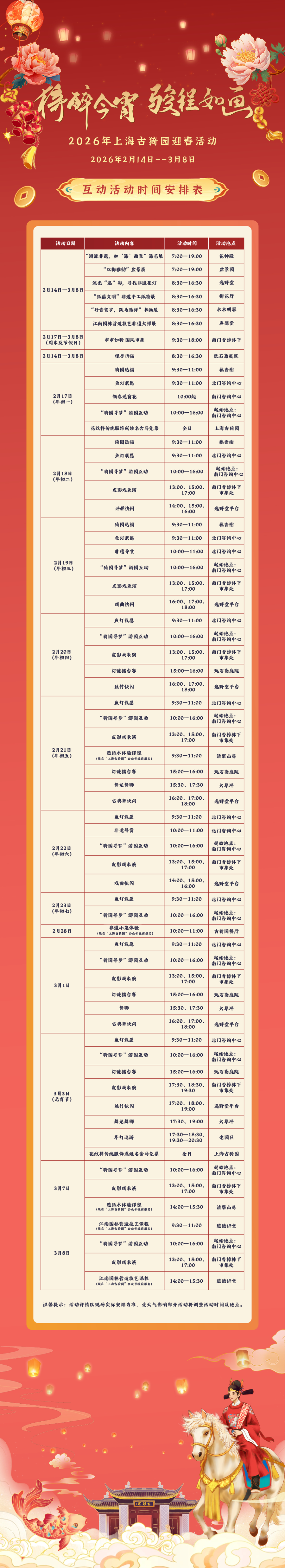 新年还有“新福利”。大年初一10:00起,游客凭全价门票可在南门游客咨询中心领取窗花(限量100份,领完即止)。迎春活动期间,道德讲堂将开设江南园林营造技艺木艺体验、非遗造纸体验等非遗美育课程,关注古猗园微信公众号可报名参与。正月初一和元宵节当日,身穿带有“花”纹样中式传统服饰,或姓名中含“马”字或偏旁部首为“马”的游客,可享免票入园福利。