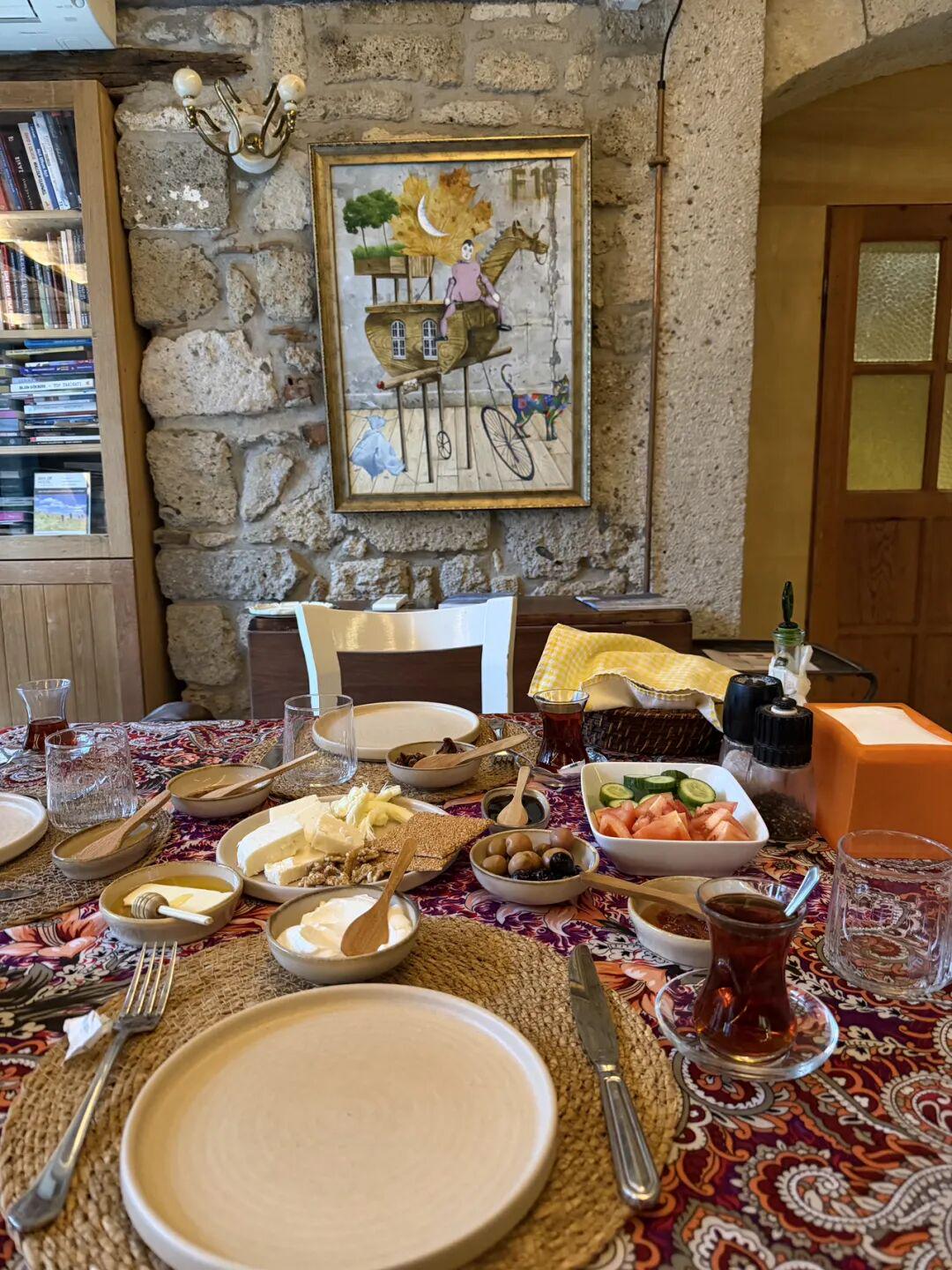 Sakin Ev的客房延续整体静谧风格,石墙搭配柔和灯光,陈设简约却舒适,空调、免费WiFi等设施齐全,部分房间还带有温馨壁炉,褪去旅途疲惫再合适不过。清晨,在庭院的树荫下享用早餐,新鲜的面包、浓郁的土耳其咖啡、地道的果酱与橄榄,都是当地风味,伴着鸟鸣与微风,开启慢悠悠的小镇时光。