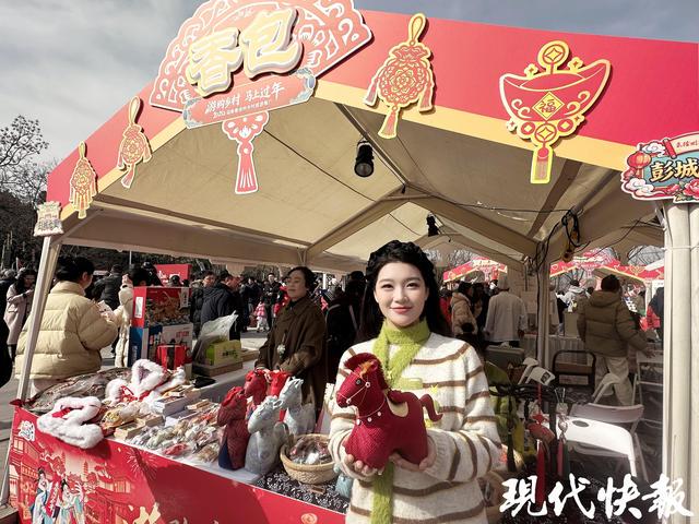 市集现场热闹非凡,书法名家现场手写春联送福。设置特色农产品区、非遗区、文创区、县市区推介区等多个板块,汇聚徐州各县(市、区)及苏皖鲁豫周边城市的百余种特色好物:丰县花饽饽、反手烧饼现场制作,邳州银杏文创、大蒜文创创意十足,贾汪马庄香包、睢宁面塑等非遗技艺匠心呈现,铜山有机番茄、经开区绿色果蔬等农特产品新鲜直供,还有临沂炒鸡、萧县老干馍、淮北花馍等苏皖鲁豫城市特色美食齐聚,打造一站式 “逛吃购玩” 体验。“这次带了马年主题香包,香包内的中草药可以助眠,香包也带有新年的祝福。”孙歌尧在现场告诉记者。
