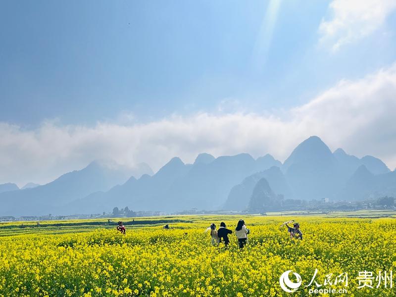 不仅如此,蒋煦还在腊月观赏到了“早花”盛景。万峰林景区内,层叠的锥峰与错落的布依村寨之间,6000余亩油菜花肆意铺展成了金色海洋,微风拂过,暗香袭来,绘就了一幅“阳光黔西南”的冬日画卷。