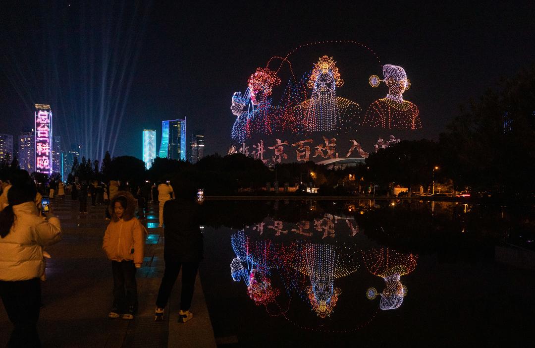 传统戏曲与合肥浓厚的科创气质碰撞出的火花,远不止舞台上的这些惊艳瞬间。这种融合体现在多个场景:在安徽百戏城,国内最大的单片翻转舞台与全息投影,可在极短时间内完成场景切换,赋予传统戏曲震撼的视觉张力;在合肥市中心图书馆,戏曲主题融合展通过巨型矩阵屏,打造出沉浸式数字光影空间,生动演绎戏曲脉络;此外,天鹅湖畔的夜空中,无人机编队时常以天幕为画卷,勾勒出戏曲行当的生动轮廓。