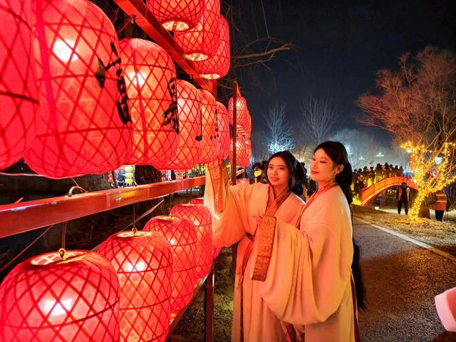 夜幕降临,景区内华灯初上,流光溢彩。各式各样的新春主题花灯错落排布,将景区装扮成梦幻般的光影世界。不少游客携家带口、呼朋唤友前来赏灯游玩,处处洋溢着喜庆祥和的节日氛围。