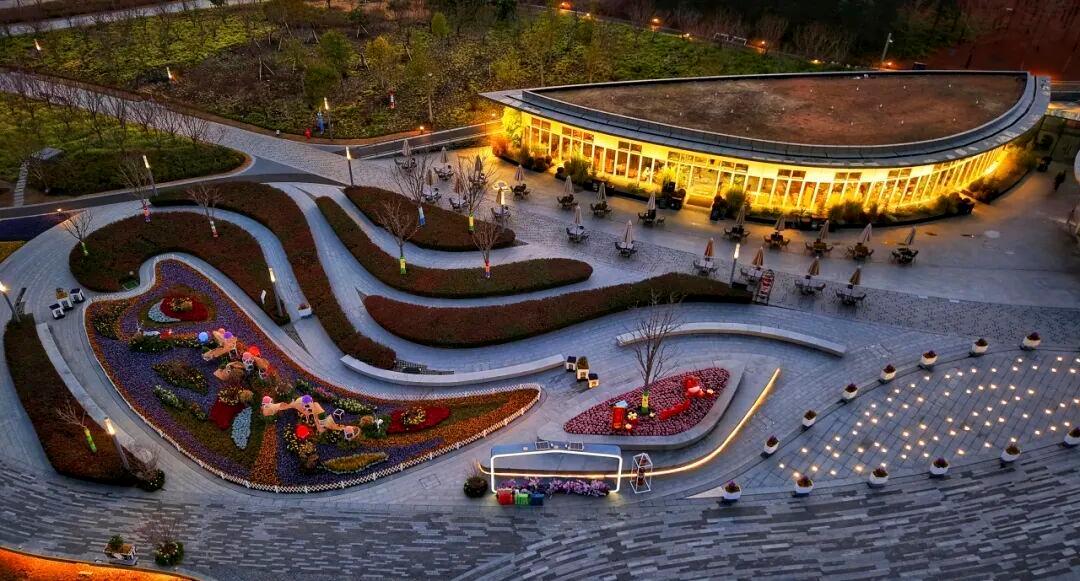当夜幕降临,公园更显流光溢彩。河面上祈福灯盏随波轻漾,灯影与波光交相辉映、粼粼闪动;景观主区域亮化一新,景观带悬挂的灯笼与地面灯带、投影灯光巧妙交融,光影交织、温馨祥和,让浓浓年味在夜色里静静蔓延。