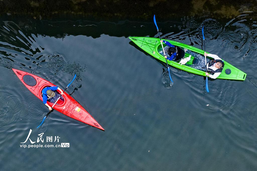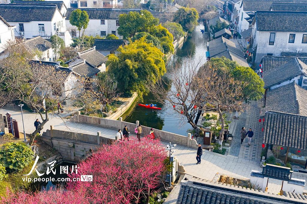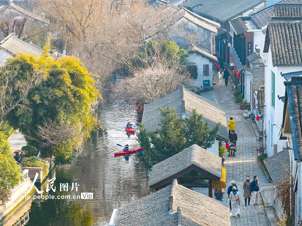 2026年2月12日,江苏省昆山市千灯镇歇马桥古村迎来春日限定美景,粉嫩梅花竞相绽放,点缀古桥流水与白墙黛瓦,绘就一幅江南春日画卷。皮划艇爱好者们穿梭于古村河道,桨声轻击水面,与岸边早开的梅花相映成趣。袁新宇摄(人民图片网)