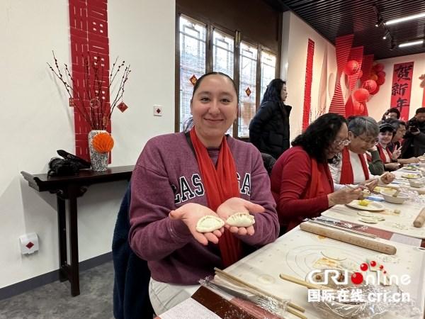 活动现场张灯结彩,洋溢着丙午马年的喜庆氛围。外籍游客们在专业师傅指导下,动手擀皮、包馅、捏褶,学习制作中国春节特色美食饺子。来自墨西哥的游客瑞娜达是第二次来中国,在体验包饺子后,她兴奋地说:“墨西哥也有类似的食物,但做法不同,这是我第一次包饺子,把饺子捏上有点难,不过相信通过多练习我可以包得更好。”瑞娜达说,中国的年味氛围太浓厚了,“街上有很多装饰,一切都非常漂亮,在这里也祝大家新年快乐、健康幸福。”