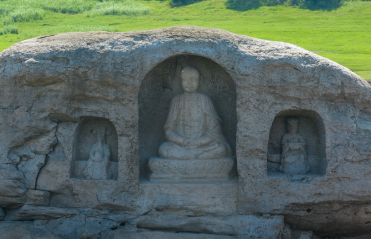 黎明说,当时经过测量整个龛高1.4米,宽1.05米,进深0.4米。中间的一龛形制最大,是最为显眼的,龛内造有一僧像结跏趺坐于仰莲座上,像高0.95米,座高0.15米。仔细看这个僧像可以发现,其为光头、弯眉,细目微睁,抿嘴,大耳,着双领下垂式袈裟,双肩搭覆云肩,下着裙,裙腰系于腹上部,双手结禅定印置于腿上。