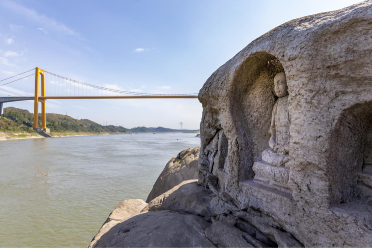 滚滚江水中,一处明显隆起的石梁上,圆拱形石龛静静伫立,龛内僧像轮廓清晰、神态俨然……连日来,随着长江水位回落,位于巴南区双河口镇长江江心的这处摩崖造像,再度走进公众视野,成为网友热议的焦点,不少网友纷纷留言咨询其具体地址、能否前往打卡等相关事宜。