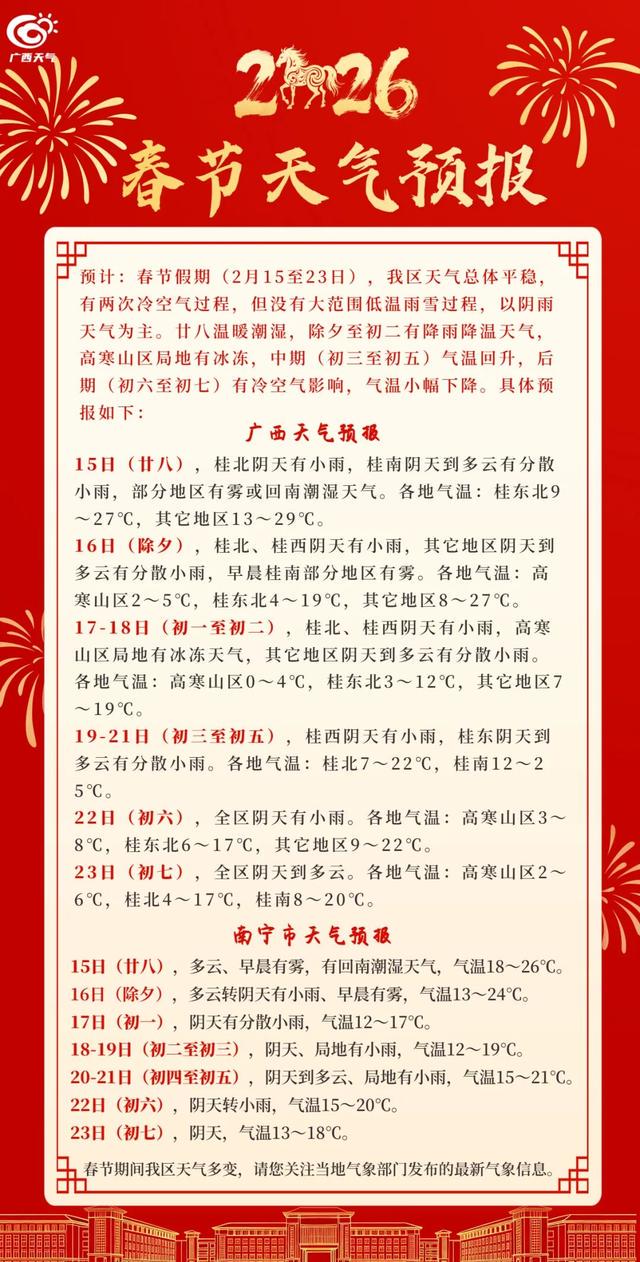 春节假期(2月15至23日),广西天气总体平稳,有两次冷空气过程,但没有大范围低温雨雪过程,以阴雨天气为主。大年廿八温暖潮湿,除夕至初二有降雨降温天气,高寒山区局地有冰冻,中期(初三至初五)气温回升,后期(初六至初七)有冷空气影响,气温小幅下降。