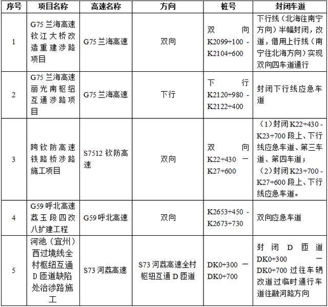 有G75兰海高速钦江大桥改造重建涉路项目等5处涉路施工区不能撤离,易因通行能力下降导致拥堵缓行。春节期间,原则上不允许施工,紧急抢修危及行车安全的设施或严重路面病害的除外,抢修路段请看链接:http://221.7.196.191:9002/gxgscx-public/#/home/homePage(广西高速公路出行信息服务网)。