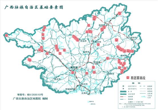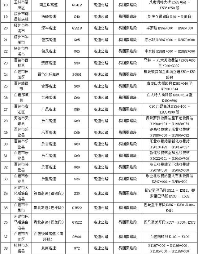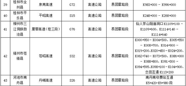 预测有S26丹峨高速南丹段南丹南收费站互通K5+420-K9+980等43段易受团雾影响(详见表5)。