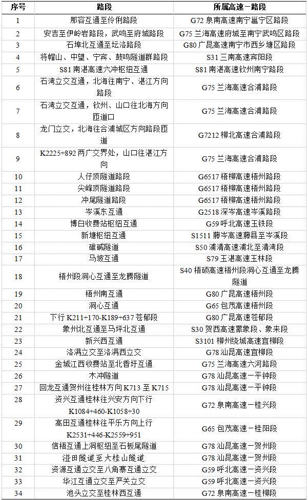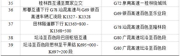 预测有G72泉南高速那容互通至伶俐路段、S40梧硕高速梧州段洞心互通至龙腾隧道等39个路段(枢纽互通)易发生拥堵缓行。(详见表2)