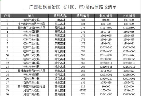 预测易结冰路段有S31三南高速K0+000至K30+000、S24阳从高速K21+000至K28+000、G76夏蓉高速K1117+500至K1122+500等20处(详见表4)。