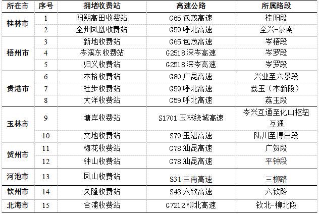 根据《全国高速公路运行监测日报》广西收费站通报数据,预测有新地站、阳朔高田站、合浦站、岑溪东站、大洋站、归义站、梅花站、社步站、塘岸站、文地站、凤山站、久隆站、木格站、钟山站、全州凤凰站等15个收费站易发生拥堵缓行。(详见表1)