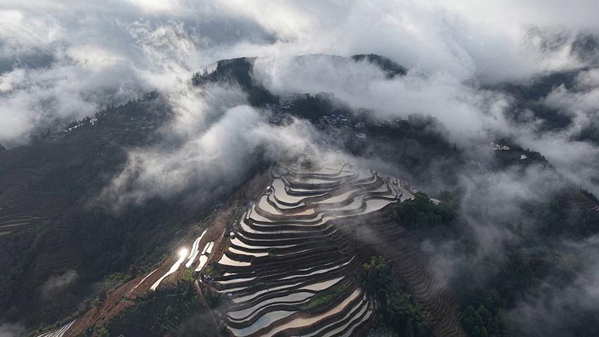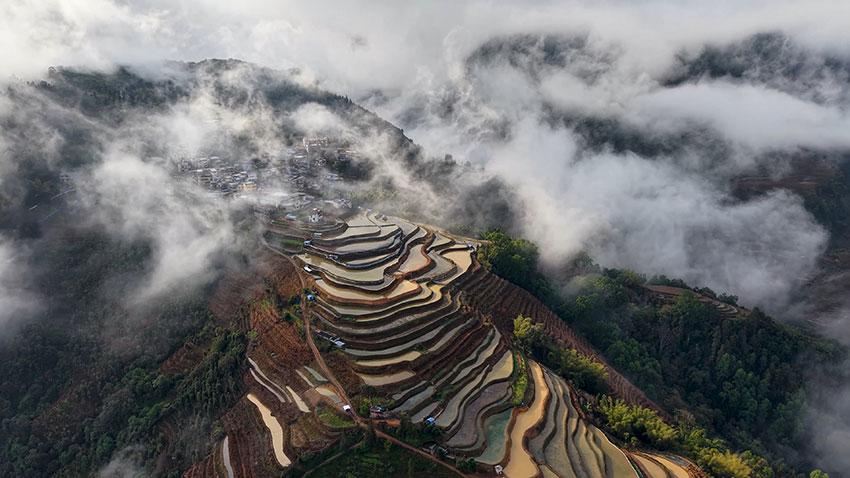 水光映着天色,薄雾漫过田埂,勾勒出哈尼梯田独有的灵秀与壮阔。这里既有山水相依的自然之美,也见证着当地人与自然和谐共生的生态画卷,为春日边疆平添一抹温润诗意。(曾智慧、黎盟、马冬师)