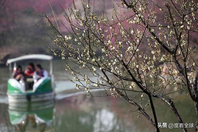 瘦西湖的“湖上梅林”,最妙的便是“水绕梅行、梅映碧波”的意境。这片梅林位于二十四桥北侧、静香书屋与洛春堂一带,近300亩的梅林沿湖带状分布,曲水穿林而过,将梅林分割成一片片错落有致的花境。乘一叶扁舟摇入梅林,桨声轻漾,惊落枝头细碎的花瓣,花影随波晃动,暗香绕船而来,恰应了“繁梅夹岸林塘幽,尽赏奇花一叶舟”的诗意。船行至梅林深处,抬头是花枝横斜,俯首是梅影摇波,两岸的梅花伸手可及,花瓣落在肩头、落在船舷上,仿佛置身于仙境之中,让人忘却了尘世的喧嚣,只剩下满心的温柔与惬意。
