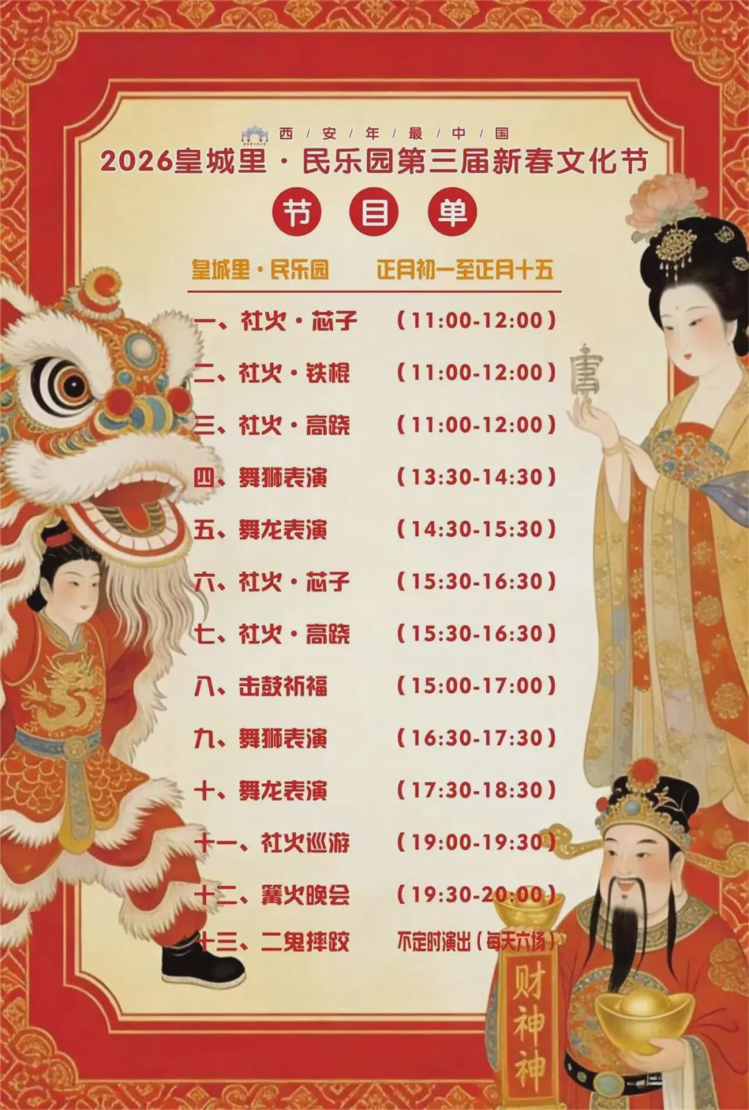 开业之后,皇城里·民乐园每年都会举办新春文化节,今年是第三届了。2月17日~3月3日(大年初一至正月十五),来这里能看舞龙舞狮、社火表演,而且还有美食集市可以一路逛吃。
